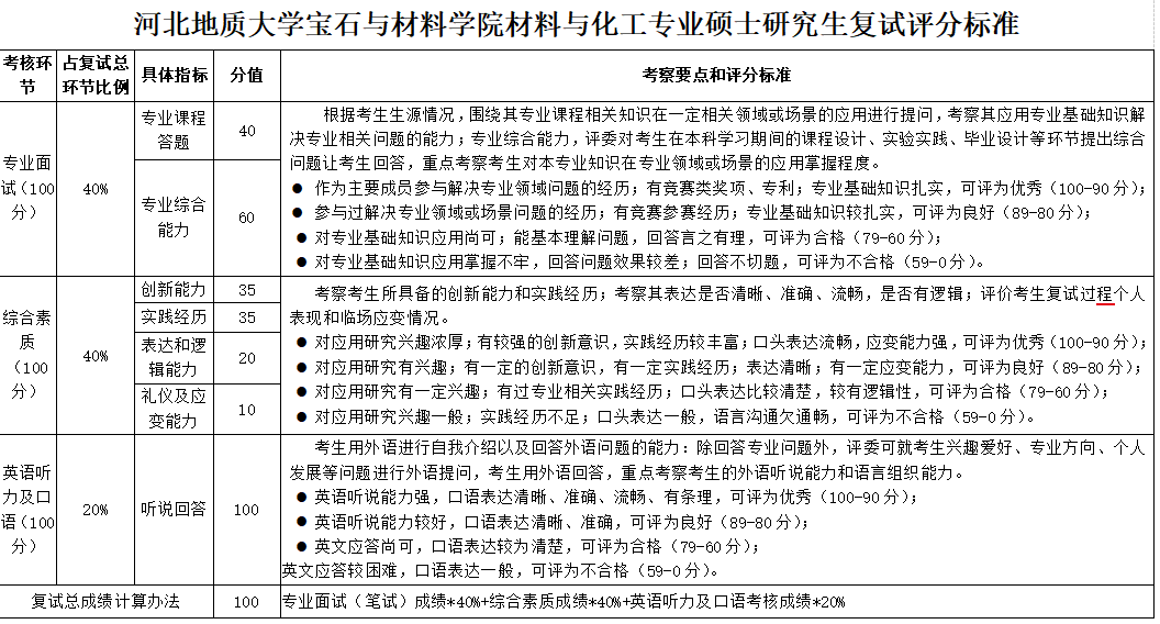 复试总成绩满分为100分。复试成绩=专业课面试成绩*40% +英语口语和听力考核成绩*20% +综合素质面试成绩*40%。