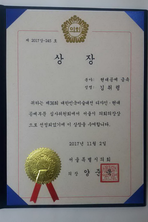 韩国美术大展是由韩国美术学会主办,包含视觉传达设计、陶瓷工艺、大漆工艺、金属工艺等多种设计学科的综合类大型比赛。比赛分作品征集及入围评奖两个阶段,奖项分为“最优秀奖”、“优秀奖”、“首尔市议会议长奖”等奖项,金属工艺组前两项均未有获奖者,金翠玲老师的作品《流逝》在近500件入围作品中脱颖而出,获得“现代工艺组——首尔市议会议长奖”,为我校在国际赛事中争得了荣誉。