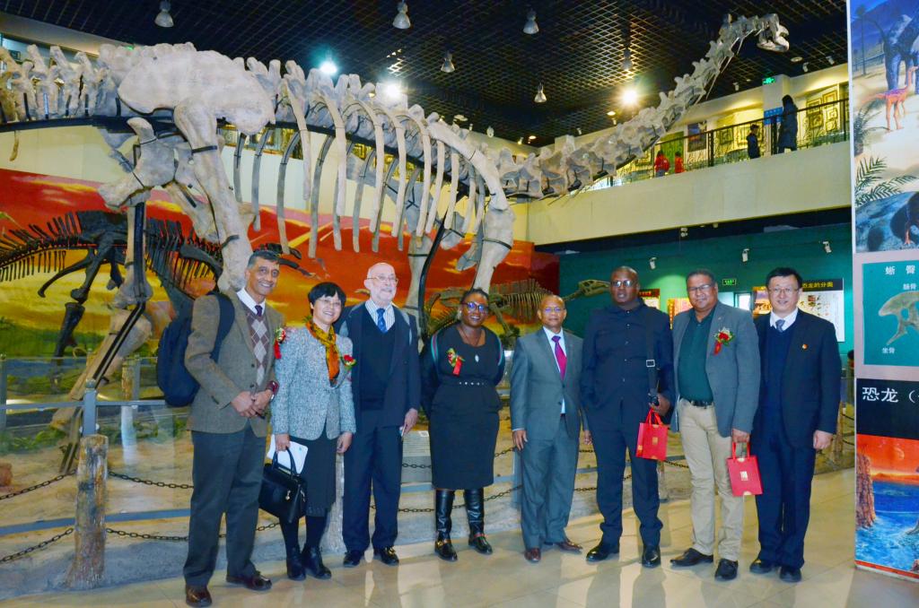 舒舒先生(左四)、基伽巴女士(左三)、范德罗斯先生(左一)、斯蒂坎普先生(左二)和王凤鸣校长(右四)、刘嘉麒院士(右二)、王仲德局长(右三)、侯建国处长(右一)共同为网黄直播