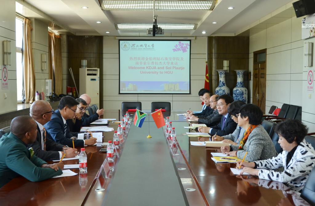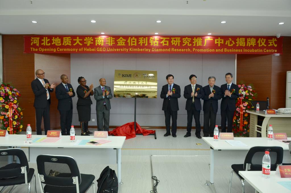 南非金伯利钻石研究推广中心揭牌,并商讨深入合作事宜。一同来访的还有北开普省政府工作人员和南非金伯利钻石珠宝孵化器及金伯利钻石珠宝学院联合董事会主席戴斯蒙德•斯蒂坎普律师,南非国家钻石交易所首席执行官康拉德•范德罗斯先生,南非金伯利钻石珠宝孵化器首席执行官伽特利索•马纳克先生,金伯利国际钻石珠宝学院首席执行官奥斯卡•萨巴蒂尼博士,索尔普拉杰大学校长尤努斯•巴利姆教授等专家学者。河北省外专局局长王仲群,省教育厅国际合作交流处处长侯建国,省国际人才交流协会会长于东,我校特聘专家、中科院院士刘嘉麒,校长王凤鸣,副校长张小平出席活动。