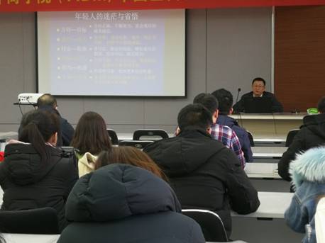 王礼胜院长为大家讲述了学校发展变迁过程及原因以及学院成立的历史及背景。接下来从“年轻人的迷茫与省悟”开始,与在场的老师共同分享了“我院青年教师应该具有的素质”,包括应具备的人文精神、应具备的敬畏意识、应具备的感恩之心、应具备的底线原则、应了解的学院文化等。接着又从习近平总书记在“2018年全国教育大会”上提出的“九个坚持”、“六个下功夫”、“教师队伍建设”、“新时代高校教师职业行为十项准则”等方面给大家进行了讲解。