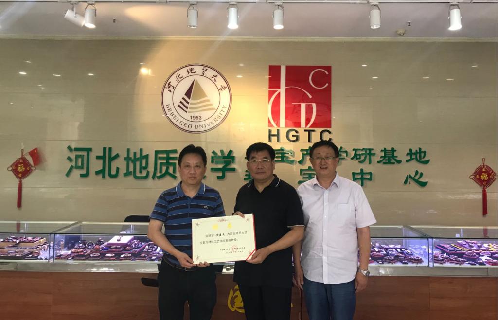 王凤鸣校长、王礼胜院长和黄建民先生进行了亲切交谈,聘请他为宝石与材料工艺学院客座教授和艺术设计(专业学位)研究生校外导师。王校长在珠宝中心亲自颁发聘书,并希望黄建民先生以后能够对宝石学院产品设计专业老师和学生多多指导。