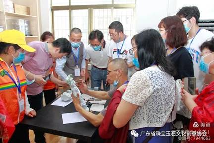 檀工为翡翠经营者和爱好者们简单介绍了翡翠首饰观赏和拿取规范。为后续玉器街和玉雕车间的参观活动的安全性提出了有效的预警。