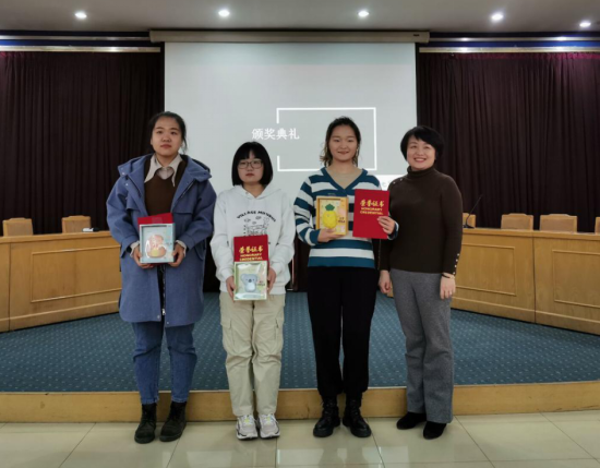 金翠玲老师为三等奖选手郭向阳、沈昊玮、阎羽馨颁奖