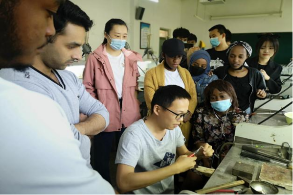 产品设计教研室主任金翠玲老师介绍了金属工艺在中国传统文化中的应用,其次由赵剑侠老师进行现场手工教学,赵老师示范了银戒指制作的起板、焊接、打磨、抛光的全过程。最后留学生们与宝石学子进行自由组队,现场体验首饰制作。在宝石学子的协助下,留学生们很快掌握了金属戒指制作的方法,并成功完成自己个性化的作品,整个活动在轻松愉快的氛围下有序展开。
