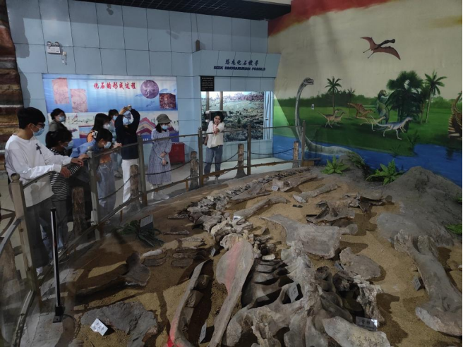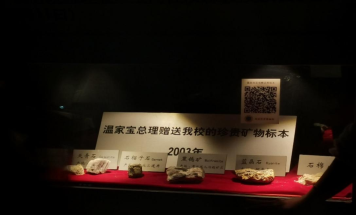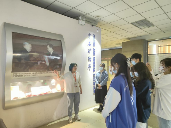 在二楼岩石与矿物厅,同学们看到了2003年我校五十周年校庆之际,由时任国务院总理的温家宝同志赠送的一套矿物、岩石标本。在三楼宝石与矿产厅温馨瑶同学带领我们参观了多种美丽的宝石,介绍了我国的四大名玉和四大印章石。了解了我国的矿产资源以及牛树银教授为代表的团队提出的幔枝构造成矿理论。最后在恐龙与古生物厅我们看到了镇馆之宝----不寻常华北龙。温馨瑶同学向我们介绍了不寻常华北龙的发掘、整理过程,科普了恐龙有关知识。