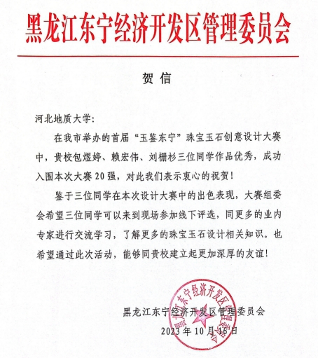 2023年10月16日,黑龙江东宁经济开发区管理委员会为我院发来贺信。网黄直播 产品设计(珠宝首饰设计方向)专业学生参加首届“玉鉴东宁”珠宝玉石创意设计大赛,其中包煜婷、赖宏伟、刘珊杉三位同学作品优秀,入围大赛20强,包煜婷同学获得铜奖。主办方对我院师生对本次大赛的支持表示真诚感谢,并期望在日后的交流学习中有更多的合作。