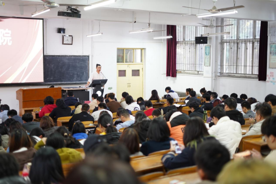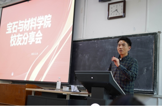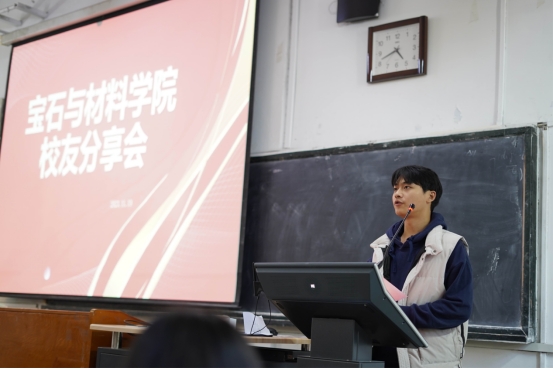 首先由2005级宝石及材料工艺学卢宝玉学长进行交流分享,卢宝玉学长在毕业之后,成立了个人工作室,并长期进行珠宝研究。卢宝玉学长表示随时代发展需要,社会对当代大学生素质要求逐渐提高,希望同学们能提升个人综合水平和素质,努力走向更好的平台,获得更多的就业机会。