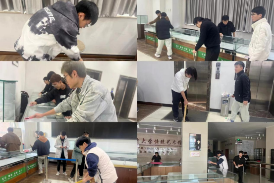 活动中,将五十名学生分为二十人和三十人两组分别被安排到一楼和二楼打扫,主要任务是擦净玻璃柜台和桌子上的尘土、清扫地面杂物并清运垃圾。不仅学生,老师和地大珠宝负责人也加入我们完成清洁任务,形成了全体动员、全体参与的良好氛围。