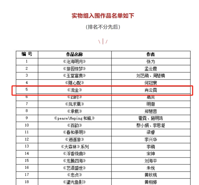 大赛实物组共收到参赛作品210件/套,经过第三届“天工”珠宝首饰设计大赛工作组的形式审查,共有122件/套作品进入11月17日的专家审查环节,经过层层筛选和激烈角逐,共有40件/套作品入围决赛。我院产品设计(珠宝首饰设计方向)专业肖云霓同学成功入围并获得优秀奖。