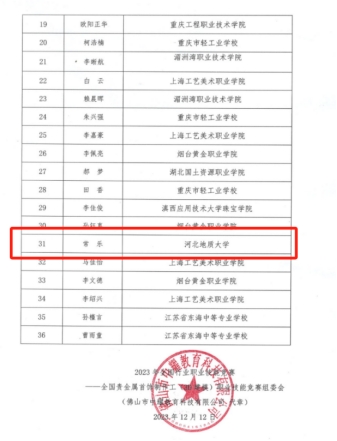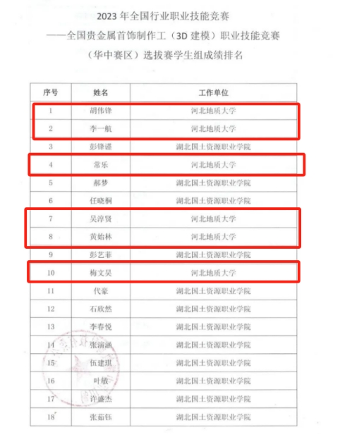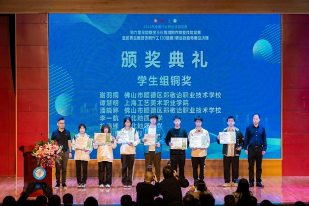 2023年12月13日,胡伟峰、常乐、李一航3名同学参加了第六届全国珠宝玉石检测制作职业技能竞赛——全国贵金属首饰制作(3D建模)职业技能竞赛(总决赛)。其中胡伟峰、李一航和常乐晋级全国总决赛,其中李一航、胡伟峰两名同学在总决赛荣获学生组两枚铜奖殊荣,常乐荣获学生组新星奖。