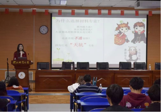 三位主任介绍完毕之后,由三位学生代表进行分享,分别是宝石及材料工艺学的温馨瑶、矿物加工工程的黄晓燕、材料科学与工程的晏江柔。通过学生代表分享自身的感受与经历可以在最大程度上提高2023级学生对于专业的了解程度与选择期望。