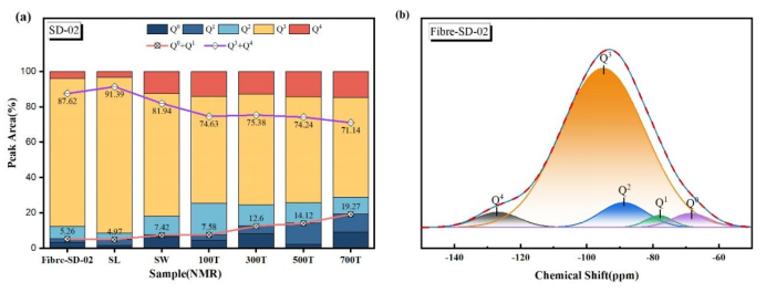 (a)玄武岩纤维(Fiber-SD-02)与不同热处理方式所得玄武岩玻璃中硅酸盐网络骨架统计图;(b)SD-02峰面积拟合图