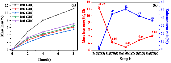 图3 (a)纤维样品在NaOH溶液中的质量损失率;(b)相较Zr(0)Ti(1)在腐蚀8h后的耐碱性提升率