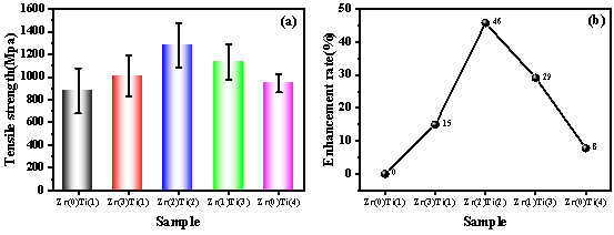 图4 (a)纤维样品的原始强度;(b)相较Zr(0)Ti(1)的强度提升率