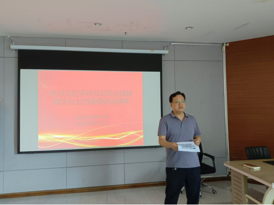 在综合楼珠宝大讲堂召开专题会议,深入学习习近平总书记在全国教育大会上的重要讲话精神。全体教工参加了会议,学院党委书记王旭辉主持并领学。