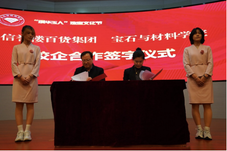 为加强校企合作,提高人才培养质量,服务地方区域经济发展,多年来,学院在校外建立了多个产教融合基地,实现了校企“产、学、研、用”协同发展。在文化节晚会现场,学院分别与信誉楼百货集团有限公司、河北润石投资集体有限公司签订了《校企合作协议》,实现资源共享,互利共赢,共同推动珠宝产业的发展。