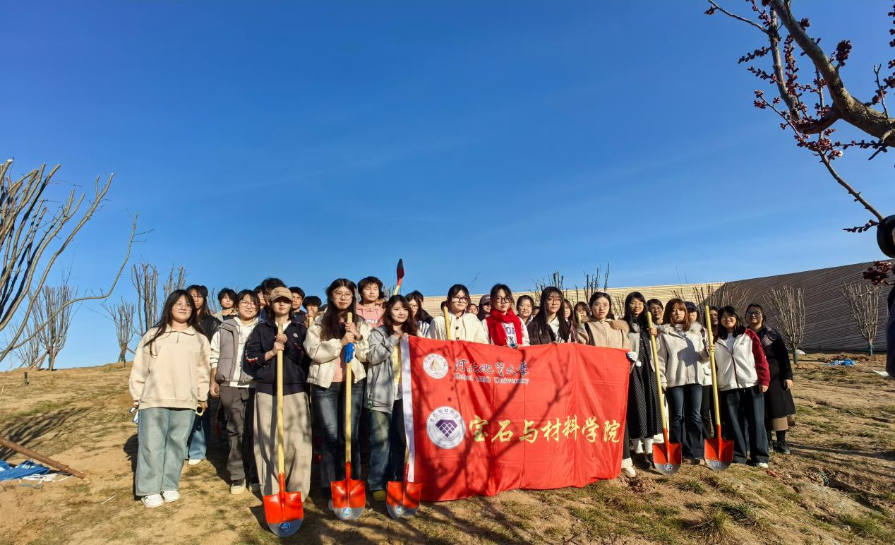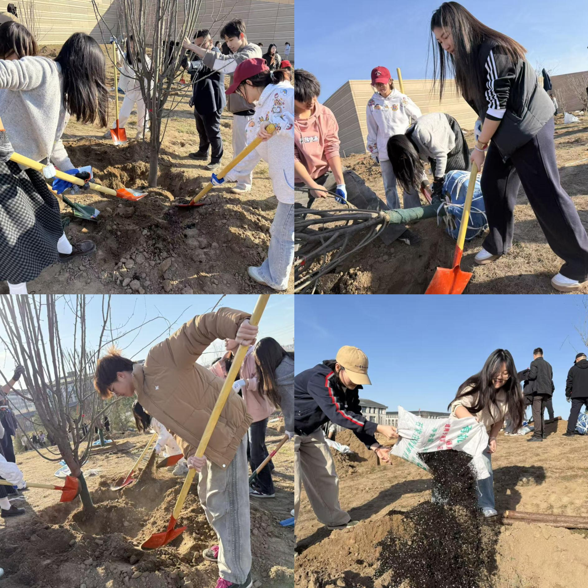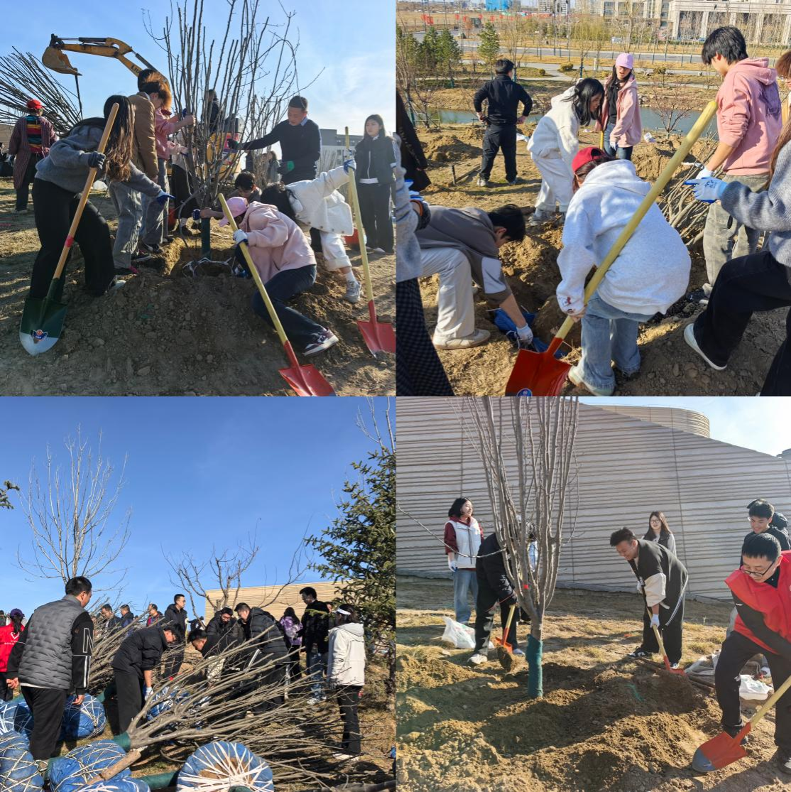 抵达现场后,大家迅速投入到热火朝天的劳动中。现场气氛热烈,秩序井然,处处洋溢着青春的朝气。在技术人员的指导下,同学们分工明确,协同作战,完整参与了植树的全流程工作:在备料区,大家合力搬运一袋袋沉重的肥料,并将其整齐码放至栽种点位;在分发点,同学们肩扛手抬,将一棵棵待栽种的树苗运送到预先挖好的树坑旁。虽然手上沾满了泥土,但没有人喊苦叫累。植树现场,大家挥锹铲土、扶苗填坑,每一个环节都一丝不苟。在栽种完成后,为了防止树苗被大风刮倒,大家三人一组,默契配合,将一根根支撑杆牢牢固定在树干周围。经过一个下午的辛勤劳作,一株株新栽种的树苗迎风挺立,为春日的大地增添了勃勃生机。