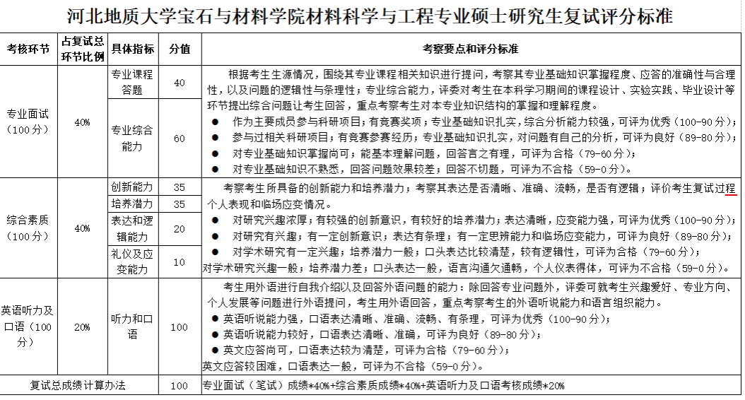 复试总成绩满分为100分。复试成绩=专业课面试成绩*40% +英语口语和听力考核成绩*20% +综合素质面试成绩*40%。