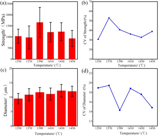 不同均匀化温度下制备的玄武岩纤维的性能(a)玄武岩纤维的抗拉强度(b)玄武岩纤维抗拉强度的变异系数(c)玄武岩纤维的直径(d)玄武岩纤维直径的变异系数