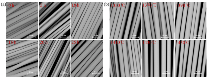 不同均匀化时间和温度下制备的玄武岩纤维SEM图像