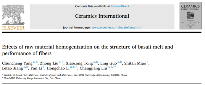 Effects of raw material homogenization on the structure of basalt melt and performance of fibers [J], Ceramics International, 2022, 48 (9): 11998-12005.