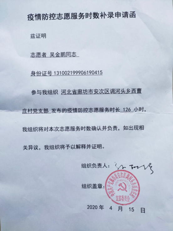 村里执勤站点忙不过来,吴金鹏主动请缨到执勤站点值班,他说:“我虽然还不是村街党支部培养的预备党员,但我是西曹庄的孩子。”村党支部书记孙树强被他的话语所感动,特批他加入党员志愿者队伍,加入到保护村街群众的一线。疫情防控期间,他积极协助村干部完成基层防控工作,巡守村内各街道人员外出情况,到西曹庄村村口进行体温检测查岗,登记并控制人员进出。