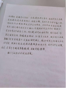 这场活动将抗击疫情与加强爱国主义教育联合起来,不仅让同学重温了团歌、入团誓词,表达了身为共青团员的真实感受,更让同学们明白了在疫情期间更应该努力发扬共青团不畏艰险的精神,同时也增强了同学们的爱国情怀和民族使命感,激发团员青年抗击疫情的精神力量。