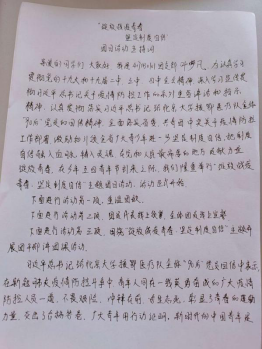 活动第三项,团支部宣传委员围绕着“绽放战疫青春•坚定制度自信”主题开展团干部讲团课活动。最后团支书对此次活动进行了总结。习近平总书记给北京大学援鄂医疗队全体“90后”党员回信中表示,在新冠肺炎疫情防控斗争中,青年人同在一线英勇奋战的广大疫情防控人员一道,不畏艰险、冲锋在前、舍生忘死,彰显了青春的蓬勃力量,交出了合格答卷。广大青年用行动证明,新时代的中国青年是好样的,是堪当大任的!在疫情防控斗争中,我校青年也奋战在疫情防控各条战线上,勇敢坚毅、奋战不息守护华夏大地,用实际行动贯彻落实总书记的要求,这场突如其来的疫情,成为了我们践行社会主义核心价值观的实实在在的“教科书”。在五四青年节来临之际,作为新时代的青年,我们要进一步坚定制度自信,厚植爱国情怀,加强学习实践、提高能力本领,争做担当民族复兴大任的时代新人,推动制度自信转化为行动自觉,投身于抗击疫情志愿服务的活动中,用所学专业回馈社会,在奋斗中释放青春激情、追逐青春理想。