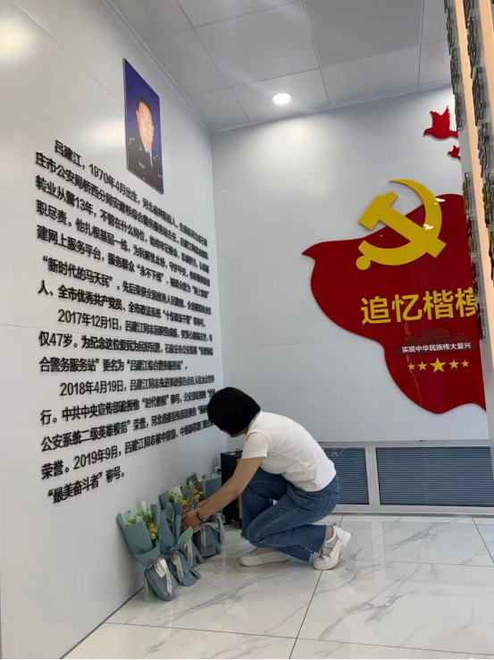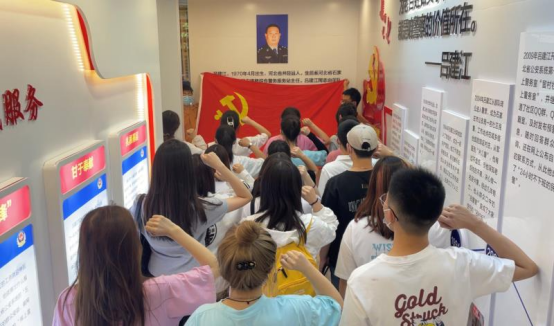 在警务站主任王永辉同志的引导下,师生们不时驻足,仔细观看,认真聆听。大家一致表示要学习他对党忠诚,不忘初心、竭诚为民的高尚情怀,永葆思诚的政治本色。为此预备党员们在党旗下进行了入党宣誓,吕建江同志的精神激励着我们全体党员学生不忘初心、牢记使命,对党忠诚,接续奋斗,砥砺前行,永不叛党。最后全体党员学生和老师代表为“吕建江”综合警务服务站民警送花并进行合影留念,他们是最美的人民警察。