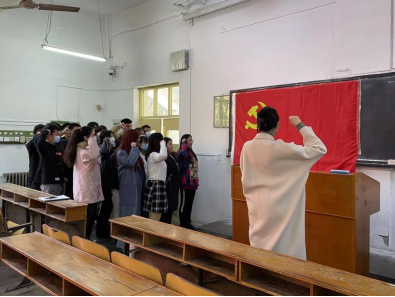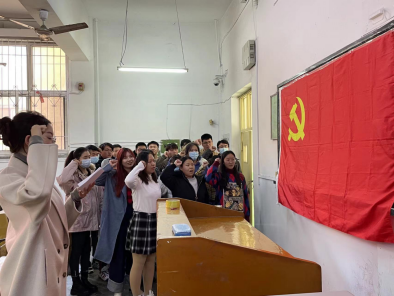 学生党支部党小组组长李纪娇带领宣誓,进行新一届党员入党宣誓仪式。新一届党员共20人,分属不同专业,宣誓时声音洪亮,充分展现了新一届党员的信心与决心。