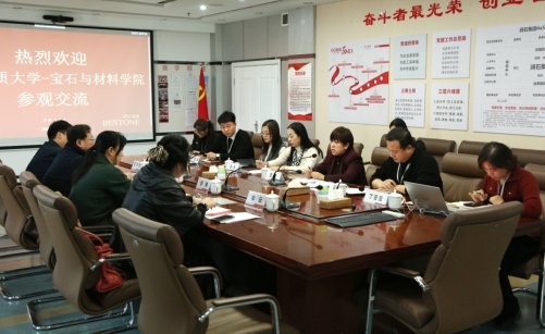 的发展历程和学科特色,介绍了学院一流的师资队伍建设和完善的教学科研实践育人体系,培养了一批批具有国际视野、创新精神和实践能力的珠宝玉石专业人才,并认为学院的人才培养和集团的战略发展是一致的。双方就党建共建、产学研融合发展、成果转化应用、人才培养模式、学生实习选用等校企合作项目开展深入交流。
