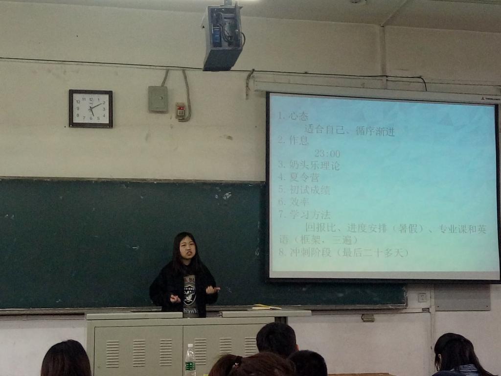 此次交流会,邀请了2014级优秀考研同学汇报他们考研奋斗之路的经验和心得。方子川同学就广大同学纠结的“考还是不考”的问题,结合自身经验,向学弟学妹们提出了自己宝贵的意见,针对考研的各科课程,学习方法及相关事项分享经验。彭碧婕、郑金宇同学细心地向大家讲解学习心历路程。