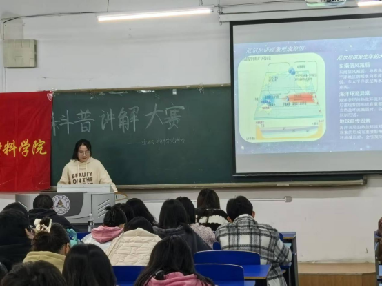 参赛选手对PPT进行5-8分钟的展示与讲解,向大家进行科普讲解。他们前期经过不同比较与思考选定不同题材,例如:参赛选手对厄尔尼诺这一气候现象进行科普,系统阐释了这一现象的成因,以及向同学们介绍厄尔尼诺这一气象如何防护。还有同学对本专业的专业知识进行科普,介绍海纹石及帕帕拉恰等宝石的外观、性质、用途等。他们精心准备,并通过一些动漫元素或者与生活息息相关的例子对科普内容进行讲解,以便于帮助大家更好的理解,从而拓宽大家的知识面,提高同学们的科学素养。各个参赛选手讲解内容紧扣科普主题,具有科学性、趣味性和实用性。