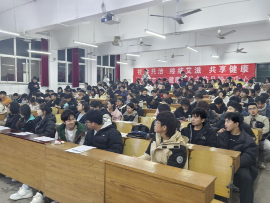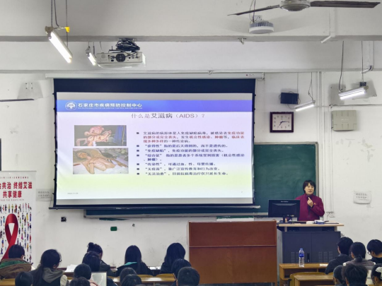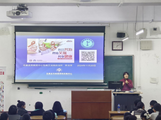 于2024年11月20日在教三楼202教室举办了一场主题为“社会共治,终结艾滋,共享健康”的专题讲座。本次宣讲由石家庄市疾控中心性病艾滋病防治所的李洁芳主任主持,2024级全体学生参加本次活动。