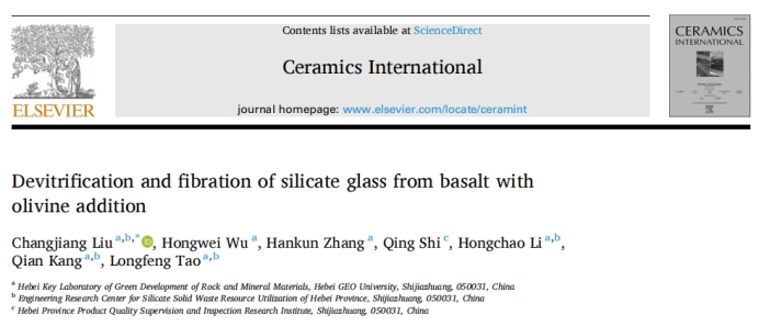 近日,我院玄武岩纤维材料研究团队在高水平学术期刊《Ceramics International》(中科院材料科学大类一区TOP,影响因子为5.2)发表题为“Devitrification and fibration of silicate glass from basalt with olivine addition”的研究论文;其第一作者为刘昶江老师,硕士研究生伍宏伟为学生一作;相关研究工作受到河北省高等学校科学研究项目资助(BJK2023040)。