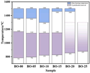论文针对传统观点“含橄榄石玄武岩不适用于连续纤维生产”展开系统验证,通过分析橄榄石添加对玄武岩玻璃析晶行为及成纤性能的影响,以典型可拉丝玄武岩为基体,掺入不同比例橄榄石(0-25 wt%),综合采用X射线衍射、热分析、高温粘度分析等手段,系统探讨了玻璃/熔体的结晶状态、聚合结构、热效应及成纤性能。实验表明,即使添加25 wt%橄榄石的熔体经1500°C水淬后仍保持非晶态;退火玻璃析晶分析显示,橄榄石的添加并未改变主晶相类型(辉石与长石),但显著提高了熔体析晶温度。研究首次发现,适量橄榄石添加可将成纤温度区间从160°C拓宽至200°C,并证实析晶温度与拉丝温度无直接关联。橄榄石通过促进低聚合硅酸盐单元生成,调控熔体结构及粘温特性,进而优化成纤行为。此外,团队提出纤维直径对数与温度倒数呈线性关联,为工艺参数设计提供了理论依据。