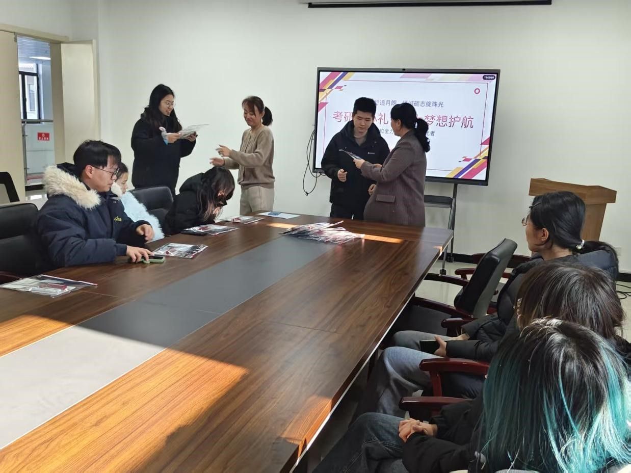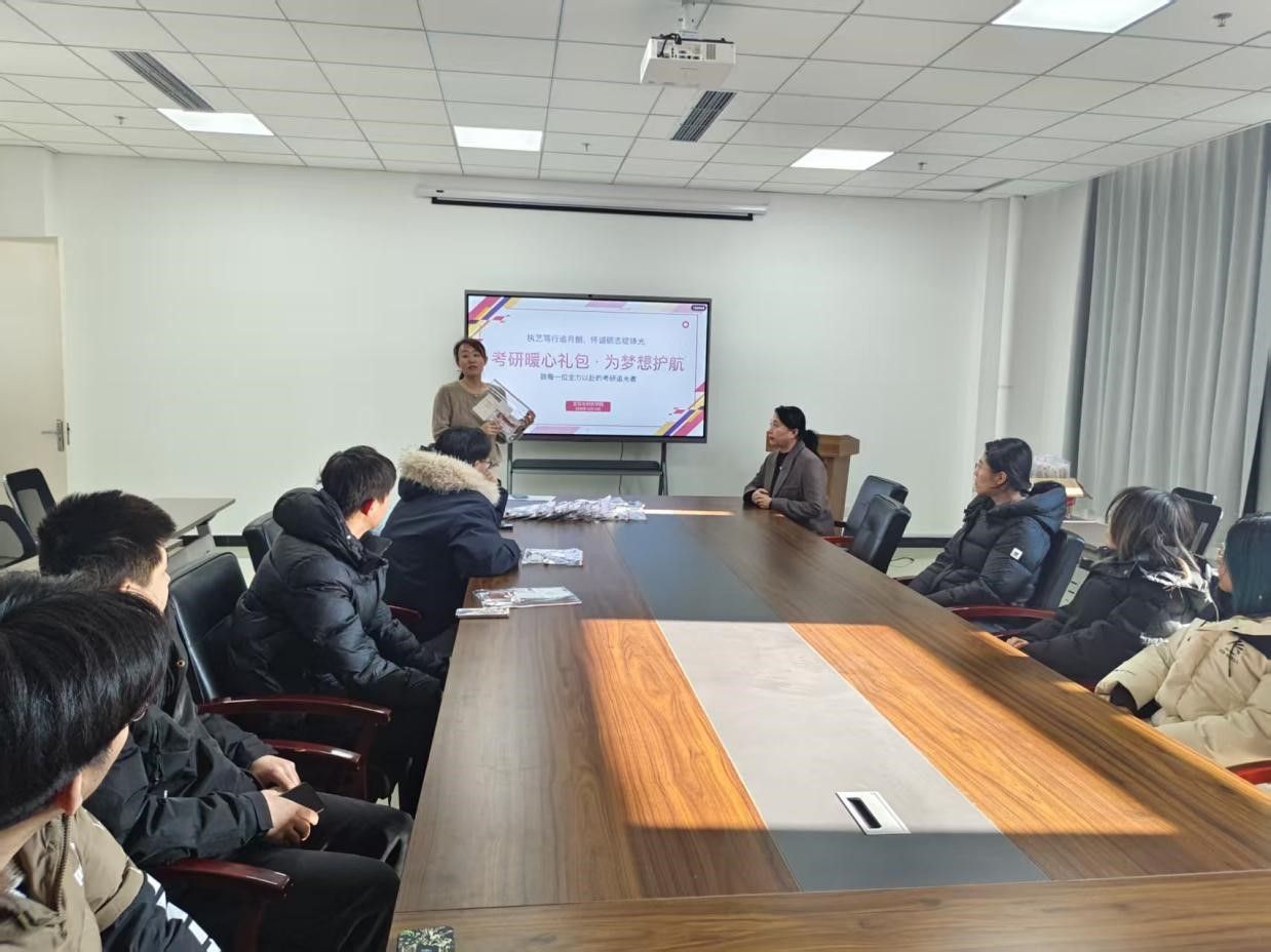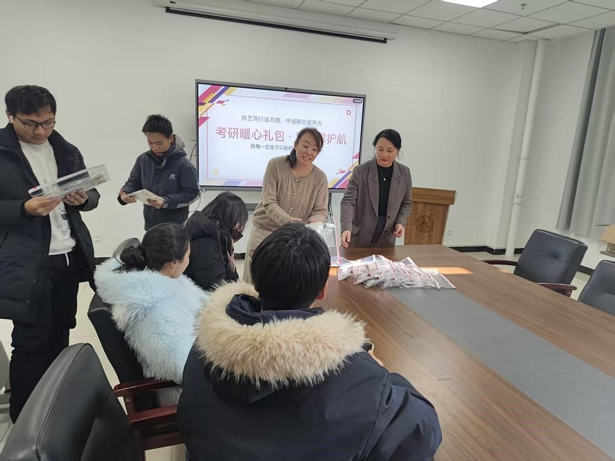 于学院楼301会议室开展“考研暖心礼包·为梦想护航”主题慰问活动。学院院长李艳、党支部书记张曼琳来到现场,为即将奔赴考场的学子们送上满载关怀的暖心礼包与诚挚祝福。