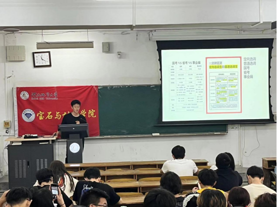 为了帮助同学们更好地了解考研与就业的相关信息,规划未来发展道路,提升求职竞争力,我院于2024年5月21日在教二110举办了考研就业分享会。本次分享会参与成员有宝石及材料工艺学教研室主任陶隆凤老师、材料科学与工程专业教研室主任刘昶江老师、2020级辅导员彭利冲老师、经验分享的学长学姐以及2021级、2022级材料科学与工程专业、矿物加工工程专业、宝石及材料工艺学学生及学生会全体成员。